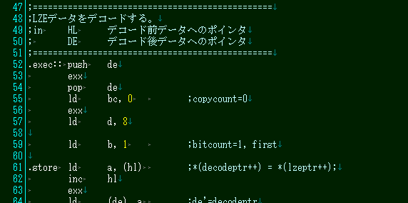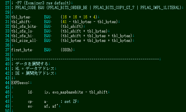 さて、使い方は簡単です。HL にデータアドレス、DE に展開先アドレスを入れて call deexo3 とするだけです。ただ、公開されているソースは tools80 でも AILZ80ASM でもアセンブル出来ませんので、ご自身で自分が使用しているアセンブラの仕様に合わせて改変する必要があります。私は自分で改変してますが、流石にこれは公開出来ませんので…。