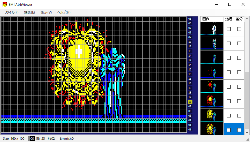 私が制作した PC-8001用のセミグラフィックデータ作成支援ツールです。PC-8001のアトリビュートは横方向に20回までという厳しい制限があります。その色制限を一目で見えるようにしたのが EMI です。簡易的ながらドット修正機能もありますので、ちょっとした異常なら、そのまま修正出来てしまいます。また、データのコピペにも対応していますので、Photoshop等の外部ツールとのやりとりも、ほぼシームレスに行うことが出来ます。