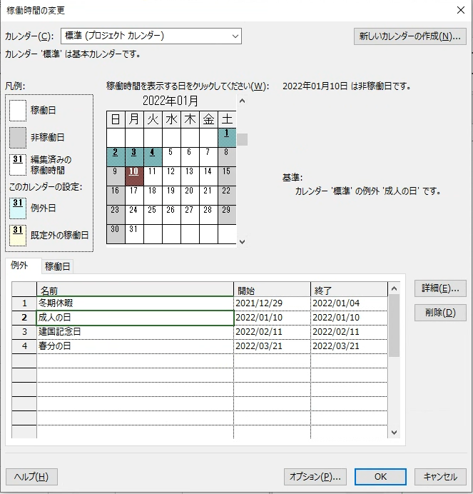 続いて、日付部分を右クリックして「稼働時間の変更」を行います。デフォルトで日曜日と土曜日は非稼働日になっていますが、祝日などは加味されていません。そのため、こちらは自分で登録していく事になります。