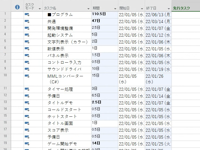続いて同様に作業工数も、テキストにしてから MSProj の期間にペーストします。この貼り付け作業後はこんな感じになります。