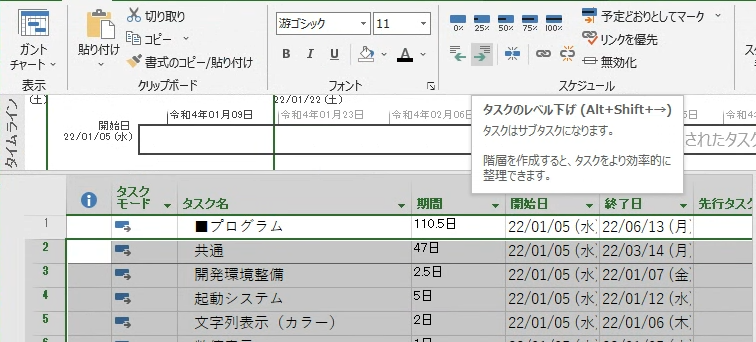 次にタスクをグルーピングするために、タイトル項目以下のレベルを調整します。まず、プログラムから画像までの範囲を行選択します。その状態でツールボタンからレベル下げボタンをクリックします。