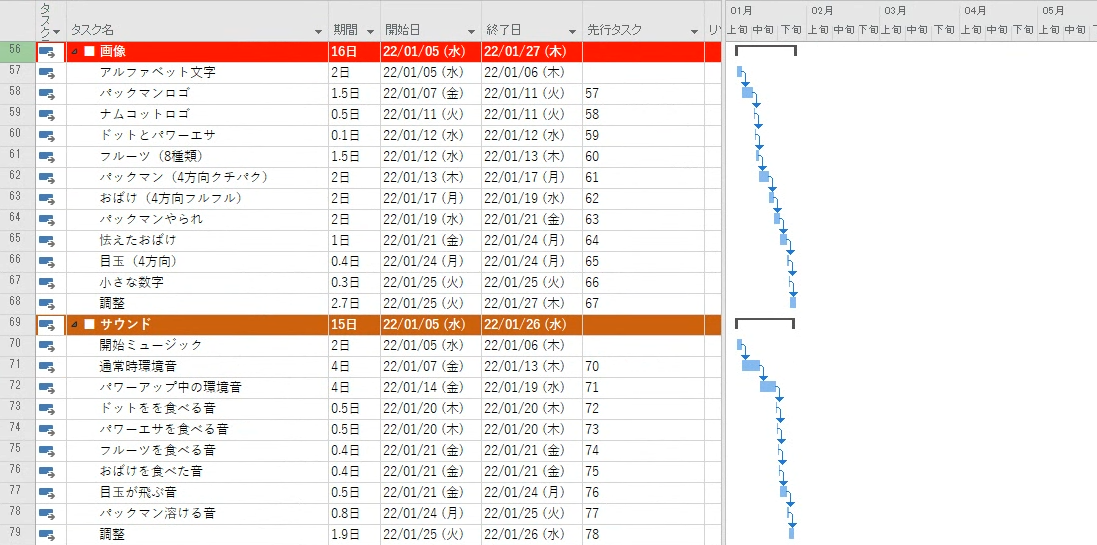 続いて、同一グループ内も行選択してタスクのリンクボタンを押していきます。この結果、タイムスケールを調整しないと全体像が見えなくなりましたので、小区分を「旬」に変更して、さらにズームも70%程度まで縮めています。完成したガントチャートがこちら