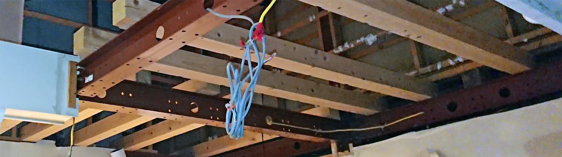 後で分かりましたが、2F 屋根裏にはそもそもヘーベル板など入ってはいませんでした。また、屋根裏収納の床は、梁となる材木を鉄骨に渡してあるだけでした。旭化成リフォーム側が言ってた、吹き抜け潰しにヘーベル板を入れて云々は的外れだった事が分かります。証拠写真もあります。