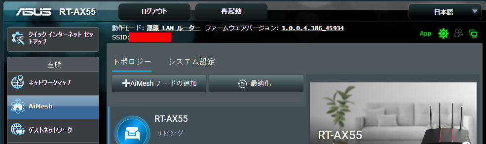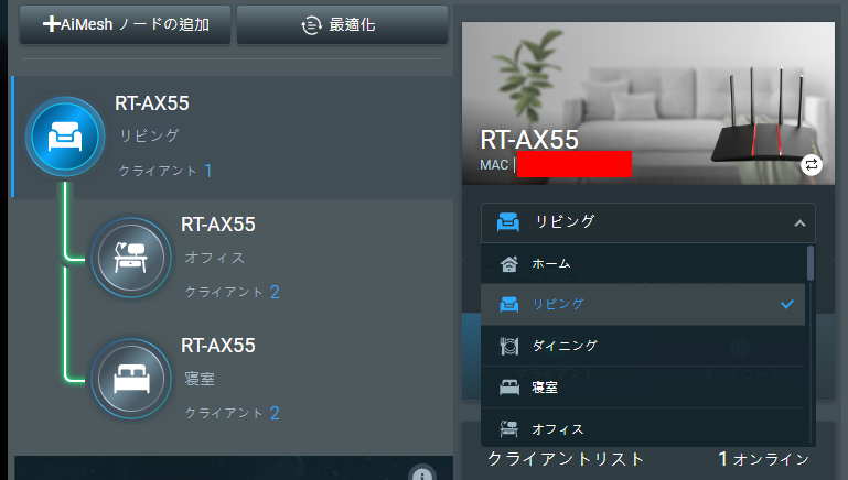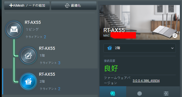 さて、このルーターを選んだ最大の理由と言っても良いのが、この AiMesh 機能です。見せてもらおう、Asus の AiMesh とやらを(違。最初に設定したルーターが親機となります。まあ WAN に唯一繋がっているルーターだから当然ですね。これを Asus ではメインルーターと呼びます。
