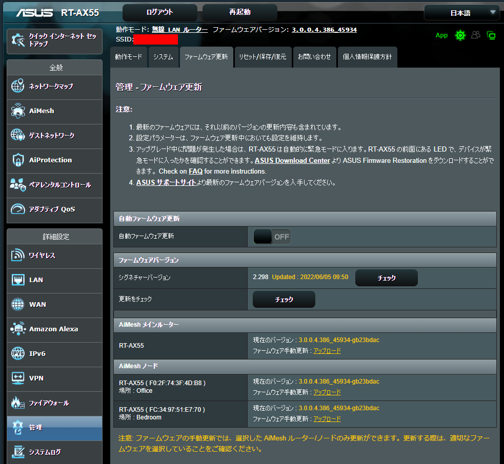 更新をチェックのボタンを押すと、サーバーにファームの確認に行きます、新しいのがあれば、メインルーターとノードも含めてまとめて更新します。…しました。いきなり更新しちゃったので、すいません、更新の様子は写真を撮れていません。メインとノードまとめてファームウェア更新するので、最後にまとめて更新が良いですよという事なんですね。