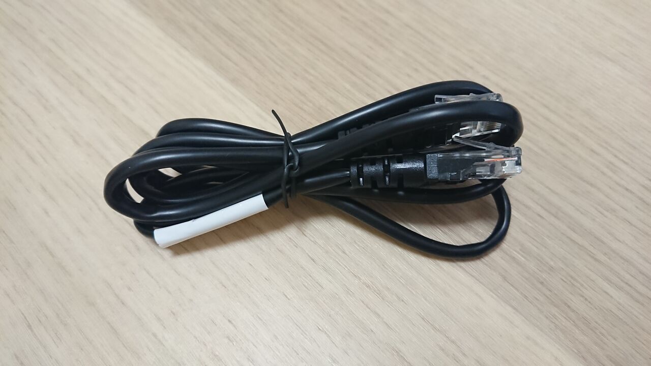 添付されていた LANケーブル。表記が無いためカテゴリ不明。不安なので緊急用と考えて、私はこれは使いません。また、箱の中に戻しました。