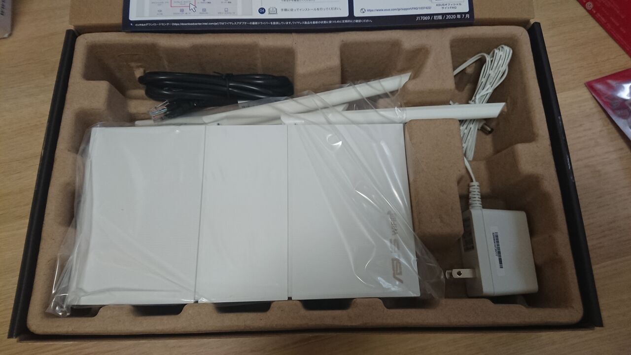 早速開封です。アンテナ4本か折り畳まれてますね。右側にACアダプタ、あと、LANケーブルが無造作に入れられています。…ビニール袋にも入ってないとか(苦笑