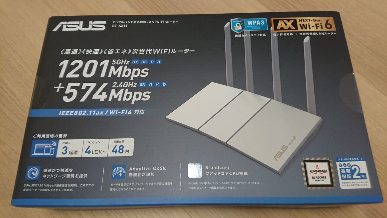 で、結局、性能で選ばず、値段で RT-AX55/W を選んでしまいました。だって、最低3台買うんです。3倍の破壊力なんです(家計直撃的に)。少しでも安く納めたいと思って、まあ、今時の製品ならよっぽどじゃないと大丈夫だろうと💦