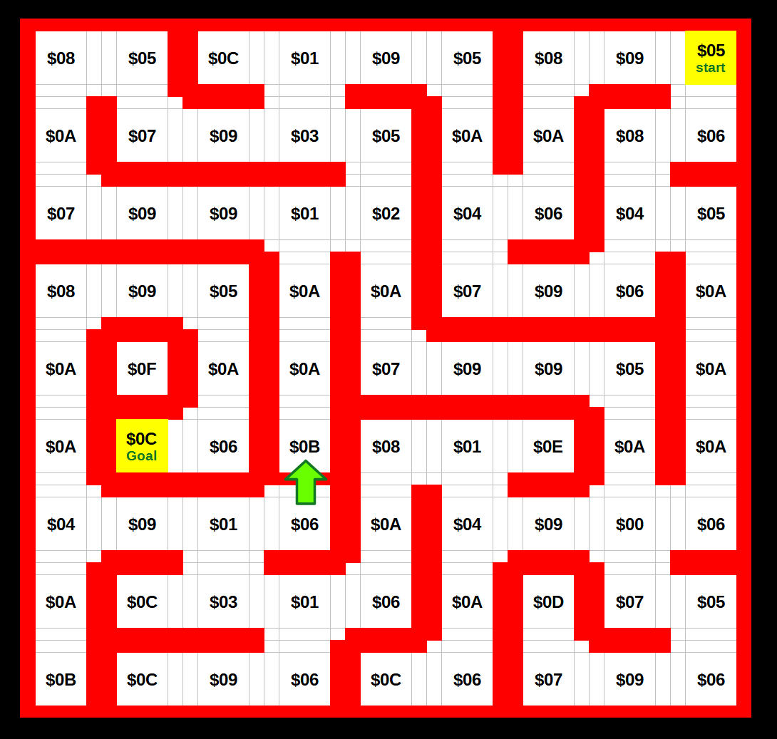 9×9サイズの迷路が81バイトで表現されています。緑色の矢印に注目してください。下側のエリアは壁番号 $06 なので、上に移動できますが、移動先は $0B なので、下には壁があります。振り向くと壁という一方通行を、このようにいとも簡単に作る事が出来ます。この $0B の場所に下から来た場合だけ「ひゅう♪」と効果音を出したり、一瞬画面を点滅させるなどの演出を入れるとより効果的です。