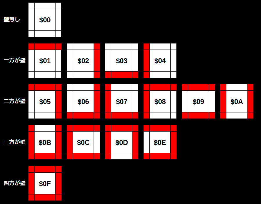 迷路ですが、壁の有る無しを精査していくと、実は16種類しか存在しない事が分かります。その16種類全てに番号を割り振ります。例えば以下のような感じです。