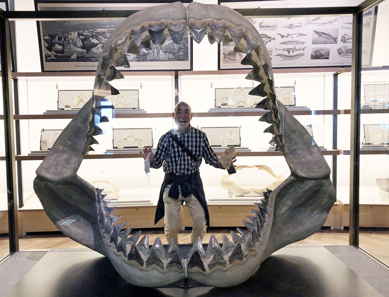 骨格標本に巨大な顎が。たぶん来園者皆やると思われる事をやってみた。ノルしかないこのビッグウェーブに!ちなみにこのデカい顎が何者だったのかは見忘れました😓