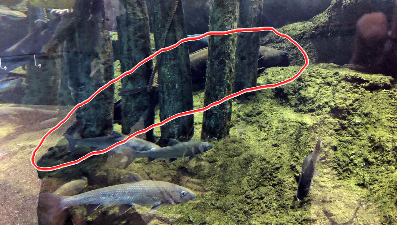 ここまで散々驚いたり感激したりで、最後に森と川ゾーン。ここには美味しそうなイワナとかヤマメとか。流石にもう普通かなあと思っていたら、最後の最後にとんでもない驚きが!ちょっと分かりにくいので赤で囲ってみました。こいつ何者か分かります?
