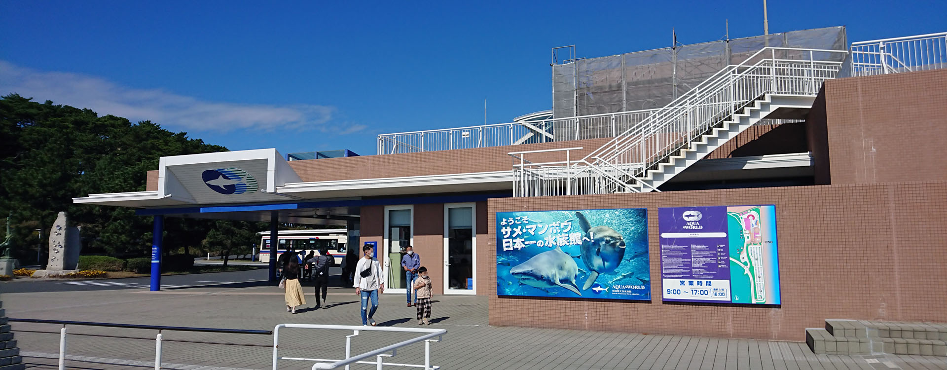 水族館は海沿いにあるのですが、荒波が打ち付けていてなかなかの迫力です。そして、到着した水族館入り口にサメ!マンボウ!ってあって心が躍る。ここはサメが有名なんですよね。外壁の一部は訪問時は工事中でした。まあ、殆ど気になりません。