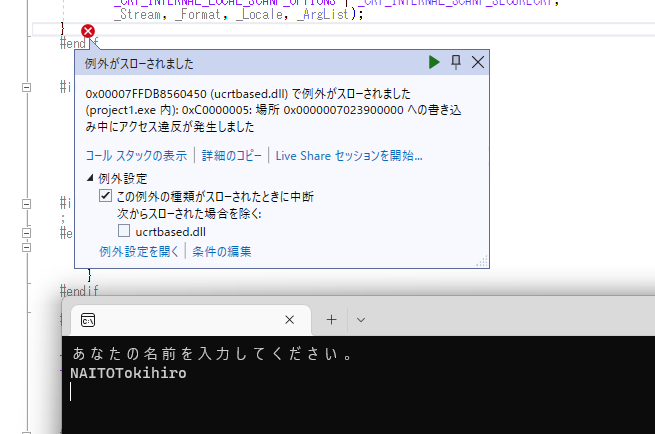 このように例外が発生しました。セキュリティとして大変マズイ、バッファオーバーランという状態を未然に防いだ形となります。以前の scanf ですと、配列要素数を超えて文字が入力できてしまったため、任意の文字列でメモリを食い潰して、対象のコンピュータに自分の意図する任意のプログラムを動かす事が出来てしまっていました。これを防ぐのが scanf_s です。例外を防ぐには、scanf_s の第3引数に最大文字数を指定します。先の例ですと
