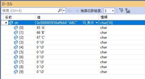 初期化した 3文字しか見えないので不安になりますが、要素数として 10 が指定されているので、配列としては 10個分取得されているはずです。これを確認するには、ローカルまたは自動で表示されている str 変数左の ▶をマウスでクリックします。配列が展開されて詳細が見えます。