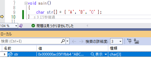 これで、str には 4個の要素が用意されます。str[3] には 0 が入ります。これなら、VS2022 のローカルには "ABC" と文字列として表示されますし、種類にも char[4] と 4個の要素が存在すると表示されます。当然、printf("%s", str); としても、正常に ABC と表示されます。