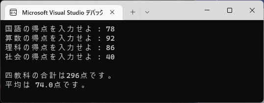 国語、算数、理科、社会の四つの教科の得点を格納する配列を宣言する。それぞれ一つずつ、得点をユーザーに入力させる。ループを使って全ての得点の合計点を求める。その合計点と平均点を表示する。平均点の表示は小数点以下1桁とする。