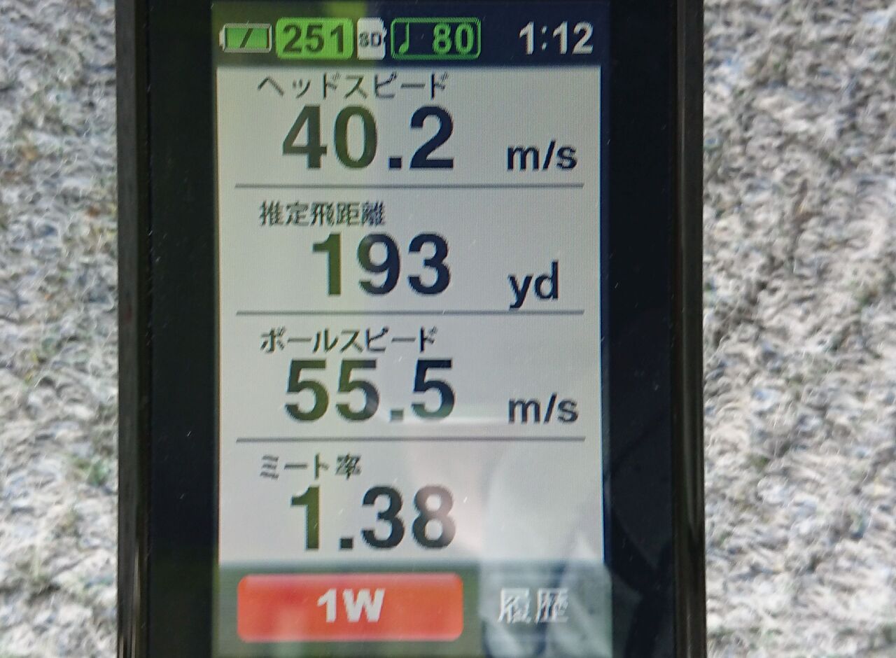 44.4m/s 出てた!普通に当たれば 220yds 飛ぶらしい。これだけ飛べばまだまだレギュラーティで戦える。以前はこの速度でラウンドできていたんですよね。そこで今度はボールをセットして再計測。