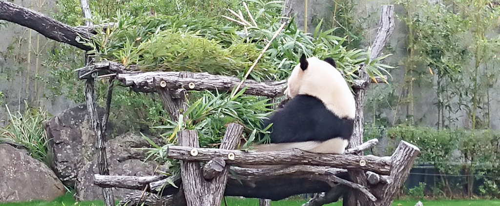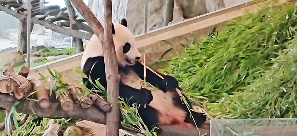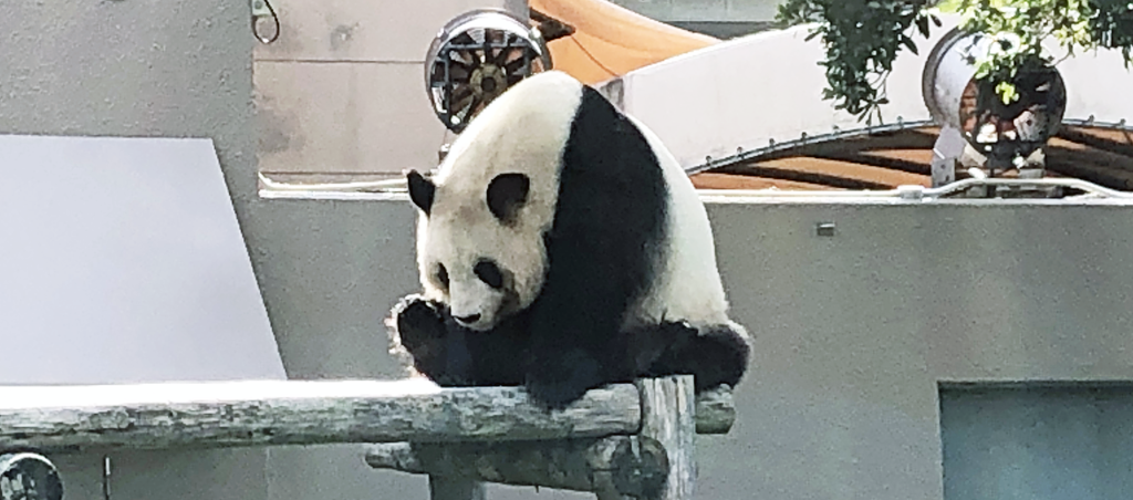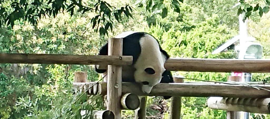 そして、いよいよ待望のジャイアントパンダです。これまた檻の中じゃないんです。普通にそこにいます。よく、象とかキリンとかだと手前に段差をつけて見物客から物理的距離を置くことで見せていますが、ここのハンダはそういう手法で見物できます。