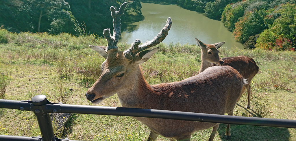 園の一角にアフリカの動物たちを集めた区画があります。流石に猛獣もいるため、人間との処理はとってはありましたが、そこをなんと自由に散策するウォーキングコースがありました。足腰弱い人には、ジープ、カート、自転車の貸出もありますし、ケニア号という連結バスに乗って園内を回ることも出来ます。そして、このケニア号は乗車無料です。ケニア号に乗らないとライオンさんには会えないらしいのですが、自由に歩いて散策しようと、私ら夫婦は歩くことを選択。