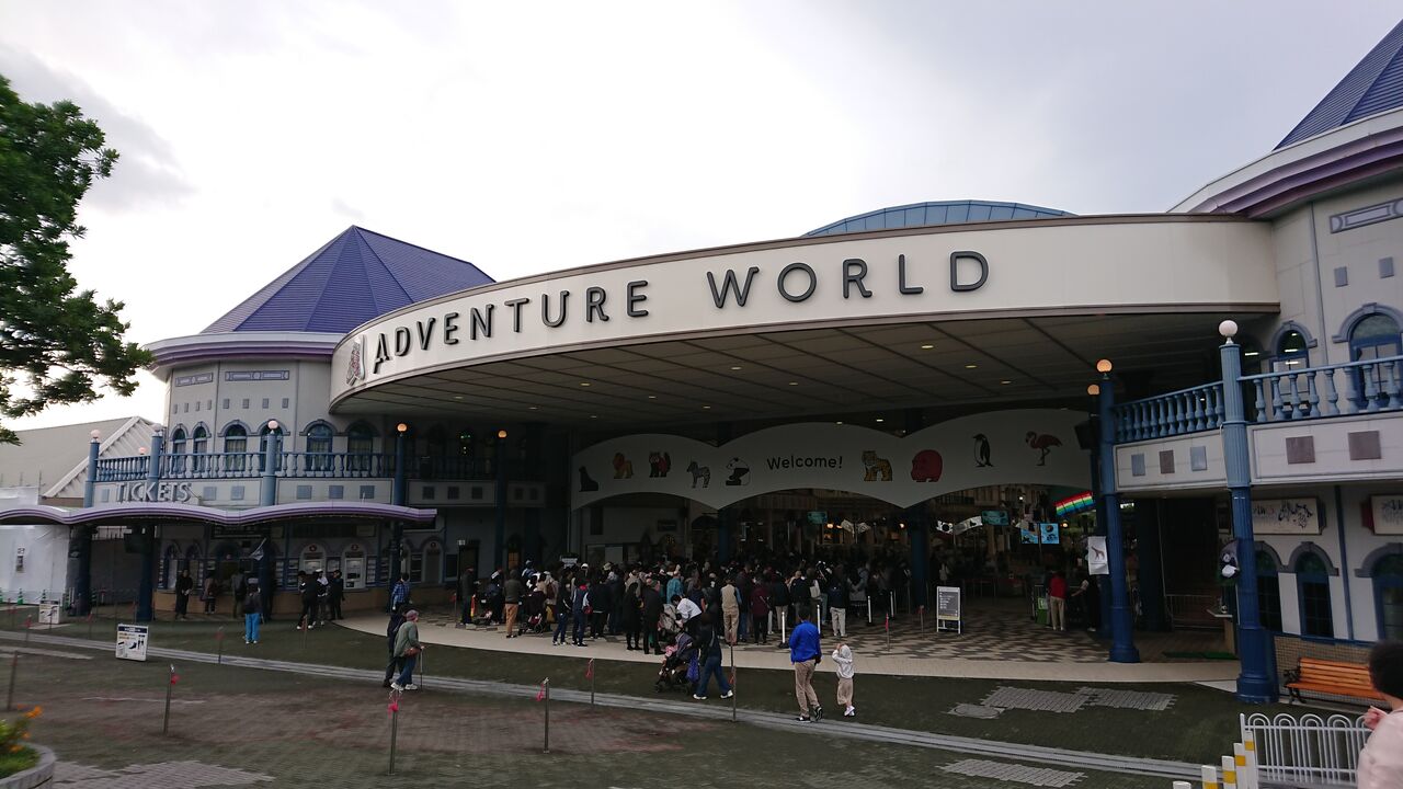 アドベンチャーワールドには開演の5分前に到着しました。平日の朝、前日は激しい暴風雨で、当日の予報でも強風予想と、とても人が集まるようなコンディションではなかったのに、既にかなりの人が入り口に集まっていました。休日は大変な人出になっていることが簡単に想像できます。