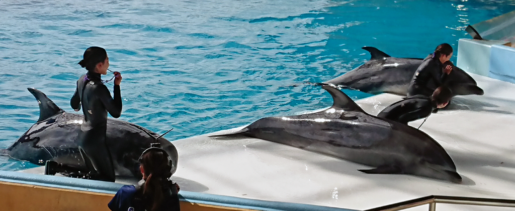 よくあるイルカショーかと思いきや、いやもういろいろ見てきましたが、ここのイルカショーは別格過ぎます。まず、登場するイルカたちの種類と数が別次元です。10数頭はいたように思います。それがプールの至るところから飛び出してきて、ちょっとカメラで捉えるのが難しいんです。大洗のアクアワールドも素晴らしいと思っていたんですが、規模も演出も何もかもが別物でした。