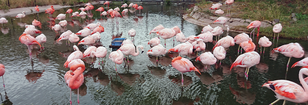 どフラミンゴの群れ。なんでも鳥インフルで数十羽が亡くなったそうで…