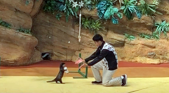 出し物は、本当に身近な小動物たちの演技でした。オットセイとかならよく見ると思うのですが、犬のコリーだとか、ペンギンだとか、カワウソだとか、黒豚だとか、もうおよそ調教とか考えにくい動物たちの演技に癒やされまくりました。これは楽しいです。