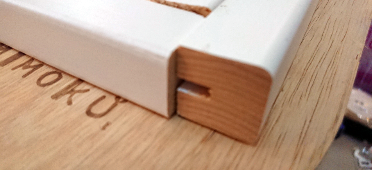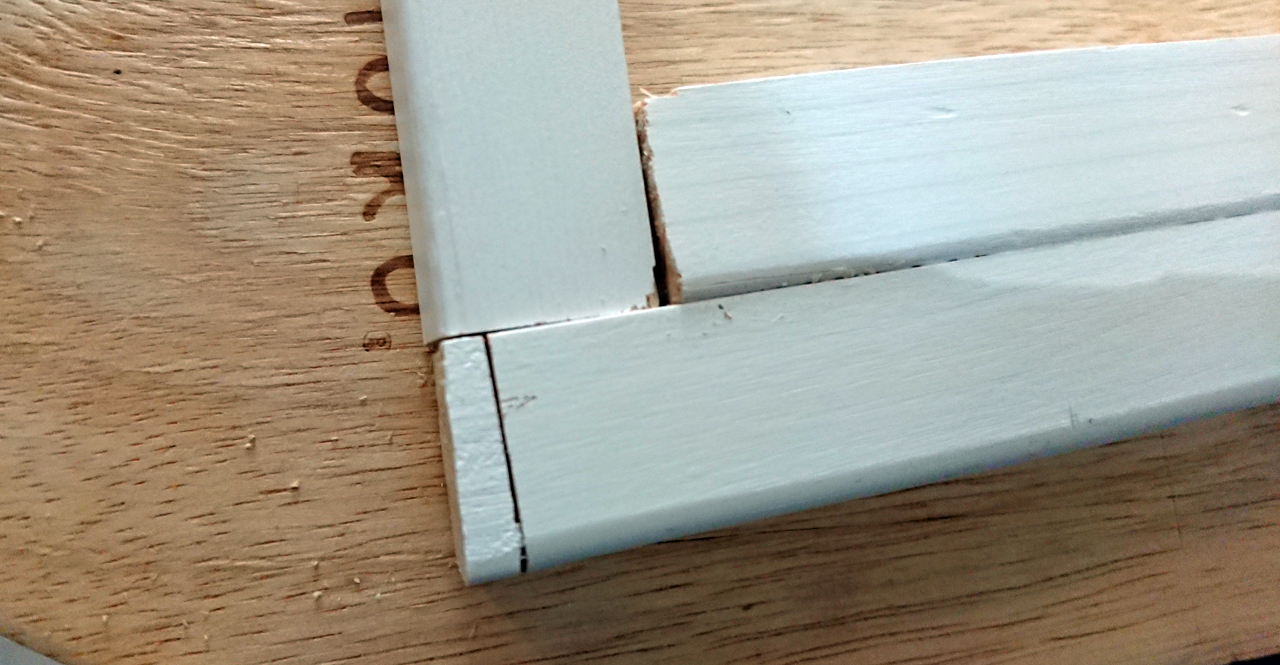 鉛筆のラインが切り出し位置です。物凄く違っているのがよく分かりますよね。速乾性木工ボンドでくっつけてから、木工鋸でゆっくり切り出します。