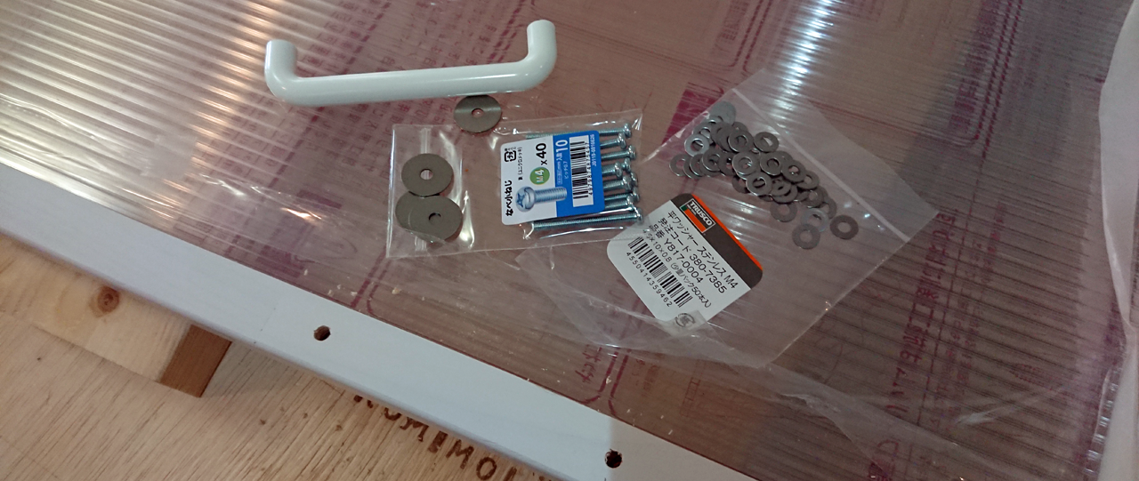 こちらは問題なく出来ました。長さが 10mm不足しているので、両面テープがはみ出してしまいましたが、まあ、うん、見えない位置だしもういいやと。なんかどんどん適当になっていく気がします😁。最後にハンドル設置です。窓の長さが縦長なので、ハンドル位置は今までは下から 150 だったんですが、今回は 200 に変更しました。まあ、気持ち程度の違いですけどw
