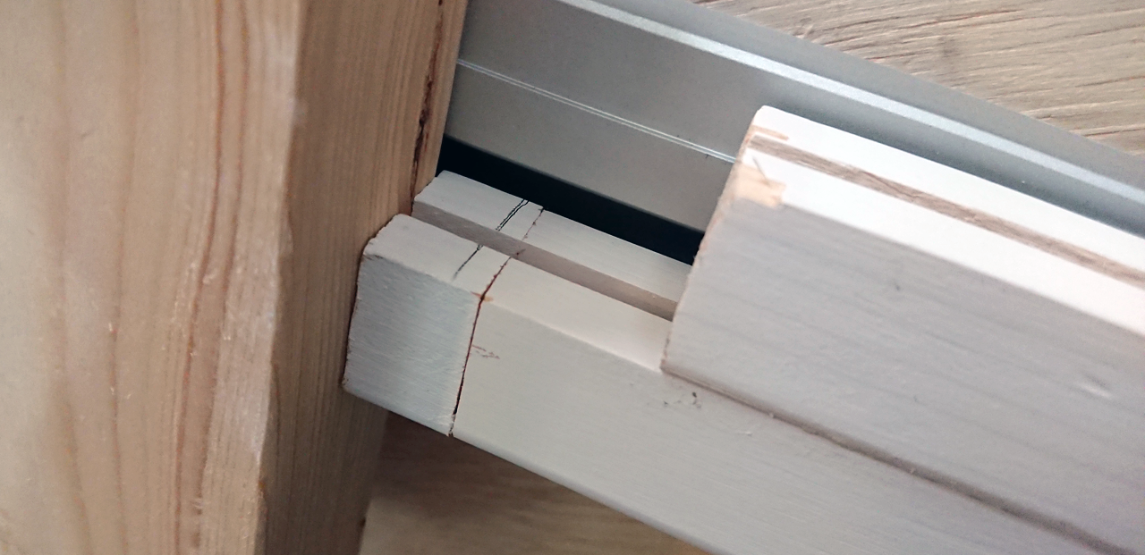 しかし、縦に長いですよね。ここまで長いと、たぶん角材が反ります。とりあえず、問題解決する方法が思いつかなかったので、パッキンで誤魔化せる範囲で済めばと神頼みで作ってみました。