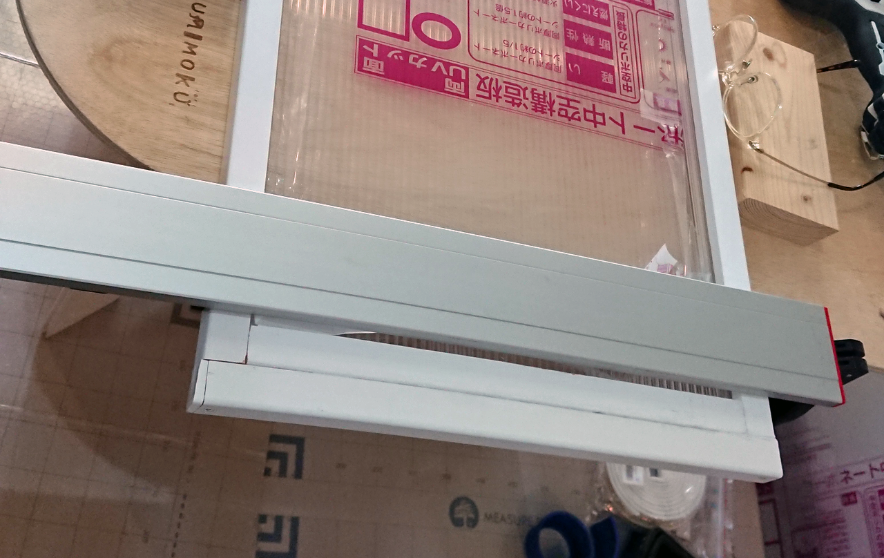 続いて中空ポリカ板も切り出します。フレーム裏側に貼り付けるのは、長さがそのままなので、先に幅 394mm で切ってしまいます。続いて、フレーム内に収める幅である 368mm でカット。368mm のは、長さを 1806 に更に切ります。