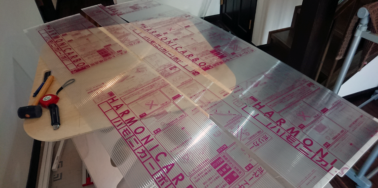 接着して抑え込んでいる写真です。実はこれでもまだ浮いてしまっていたので、斜め釘打ちで無理やり抑え込んでいたりします。こういう逃げ技ばっかり覚えてしまうのは、ちょっとまずい傾向ですよね…。さて、気を取り直して、続いてフレームの裏側にポリカ板を両面テープで貼ります。