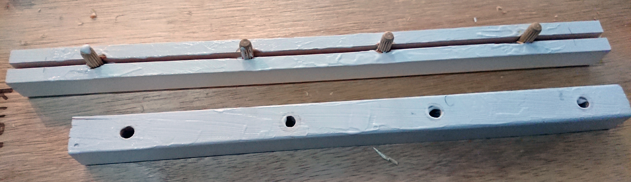 そこで下のフレームを角材2段重ねとすることで、この問題を解決することにしました。この接合にはダボ木を使うつもりです。接着剤だけだと弱すぎですし、ネジだと割れる怖さもあります。幸い、割れにくい竹用ドリルがあるので、これでダボ穴を開けようかと。