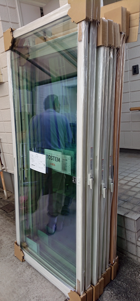 工事日は追って業者から連絡が入るとの事。但し、やっぱり注文が立て込んでるので、下手すると GW 過ぎるかもと言われまして、うひゃーまたかーと思ってたんですが、やっぱり翌週には連絡が入って、4月11日はどうでしょうと言われたので、ぜひそれでと返答しました。嫌だとか言ったらいつになるか全くわかんないですからねぇ^^;工事には作業者2名が来ました。一人は金額見積りの下見に来た人で、もうひとりは見るからに下っ端のおじさんです。元気が残っているうちに 2F から作業しますと言われまして^^; トラックから降ろした窓の部材は、駐車場にあるのでそこで梱包を剥がして、えっちらおっちらと手持ちで階段経由で2Fまで運んでいきます。もうひとりのおっちゃんが窓枠の取り付けをして、運んできたヒトが取り付けと調整をしていきます。