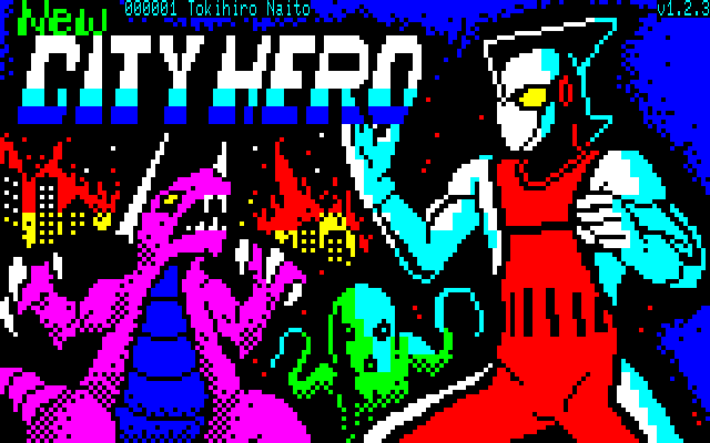 私が数年前に作成した Newシティヒーローというゲームも、ローディング画面があります。アニメもします。こちらは最近作成したのでデータ圧縮技法が使えましたのですが、それでも読み込みに12分かかっています。これは、8KBの拡張RAMに対応してるためで、折角圧縮してるのに、読み込むデータサイズが増大したので、全く読み込み時間の短縮には貢献していないという…。ただ、圧縮していなければ15分以上は確実にロード時間は掛かってるはずなので、かなり効果はあったと思います。