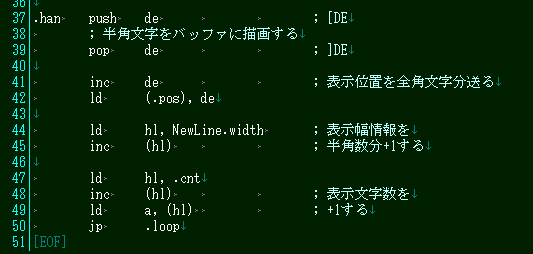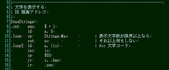 文字の描画開始の前にカウンタをゼロクリアします。これは、現在文字をいくつ処理したかのカウントです。6以上になったら処理を中断してメインループに戻ります。