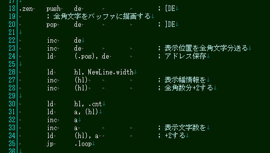 文字表示は描画アドレス、描画範囲、文字数を適宜更新する必要があります。全角文字の場合は、横に2バイトの大きさとなりますので、以下のような処理になります。