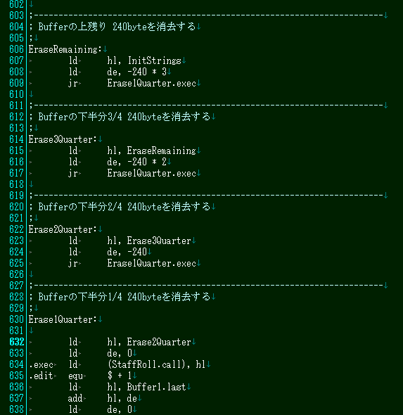 HL にバッファの一番下のアドレス Buffer1.last があります。ここに DE オフセットを加算(実際にはマイナスの値を加算するため減算になります)します。DE を 0 として、PUSH DE を8回羅列する事で、16バイトのゼロクリアを行い、それを 15回ループとしています。16×15 = 240 となり、この処理部分で 240バイトのクリアとなります。