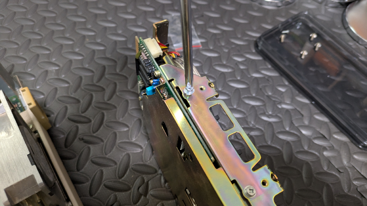 GOTEKマウンタとドライブ2FDDの間に固定用のブラケットを入れます。中心に見える2箇所のネジを締め直します。