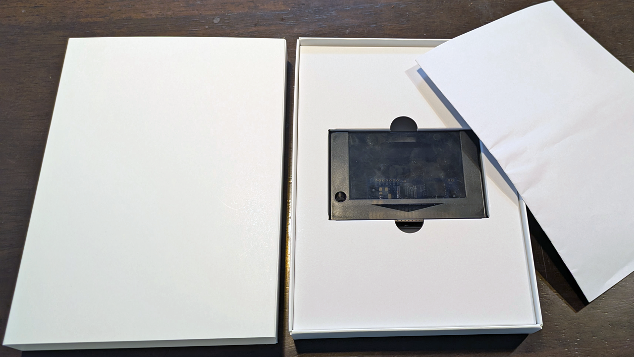パッケージサンプルが届きました。よれよれの紙は、マニュアル想定サイズで私がA5相当でサイズ確認したモノです。カートリッジがスポンと収まって、全くガタツキ無し。初めての挑戦の割には上手くいってると思います。