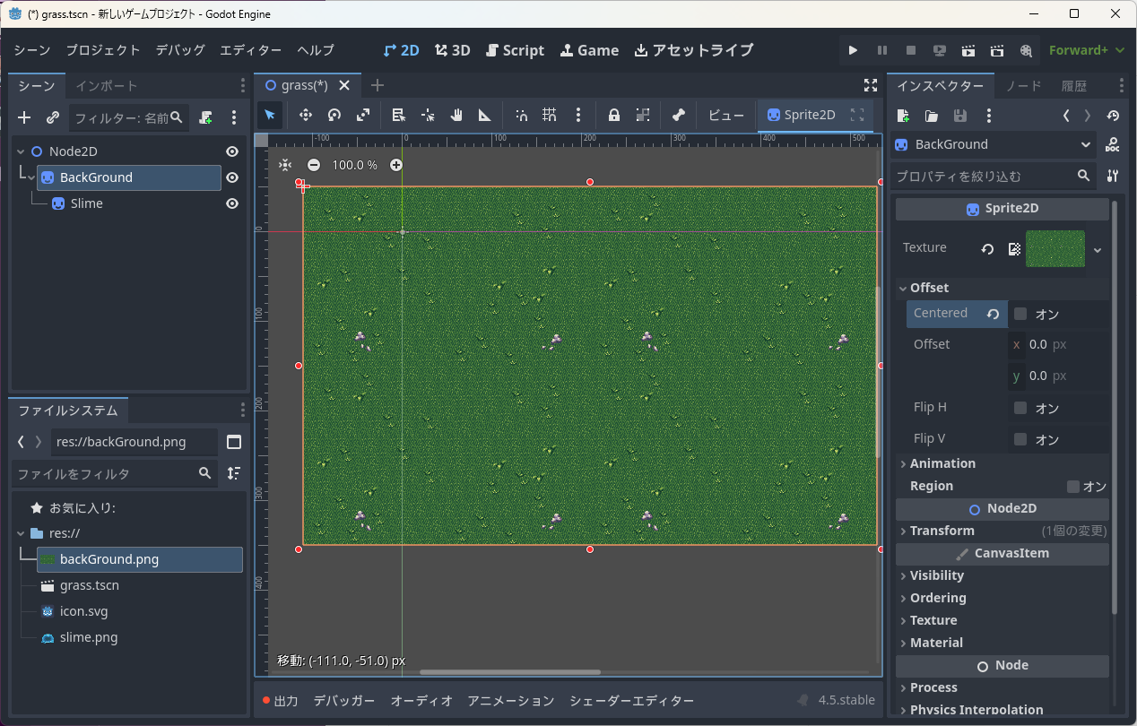 もし、シーンの保存後に Godot を終了してから再起動するなどして、シーンに BackGround が表示されていない時は、慌てずファイルシステムから保存済みの grass.tscn をダブルクリックしよう。これでまた、シーンにノード構成が表示されるようになるよ。