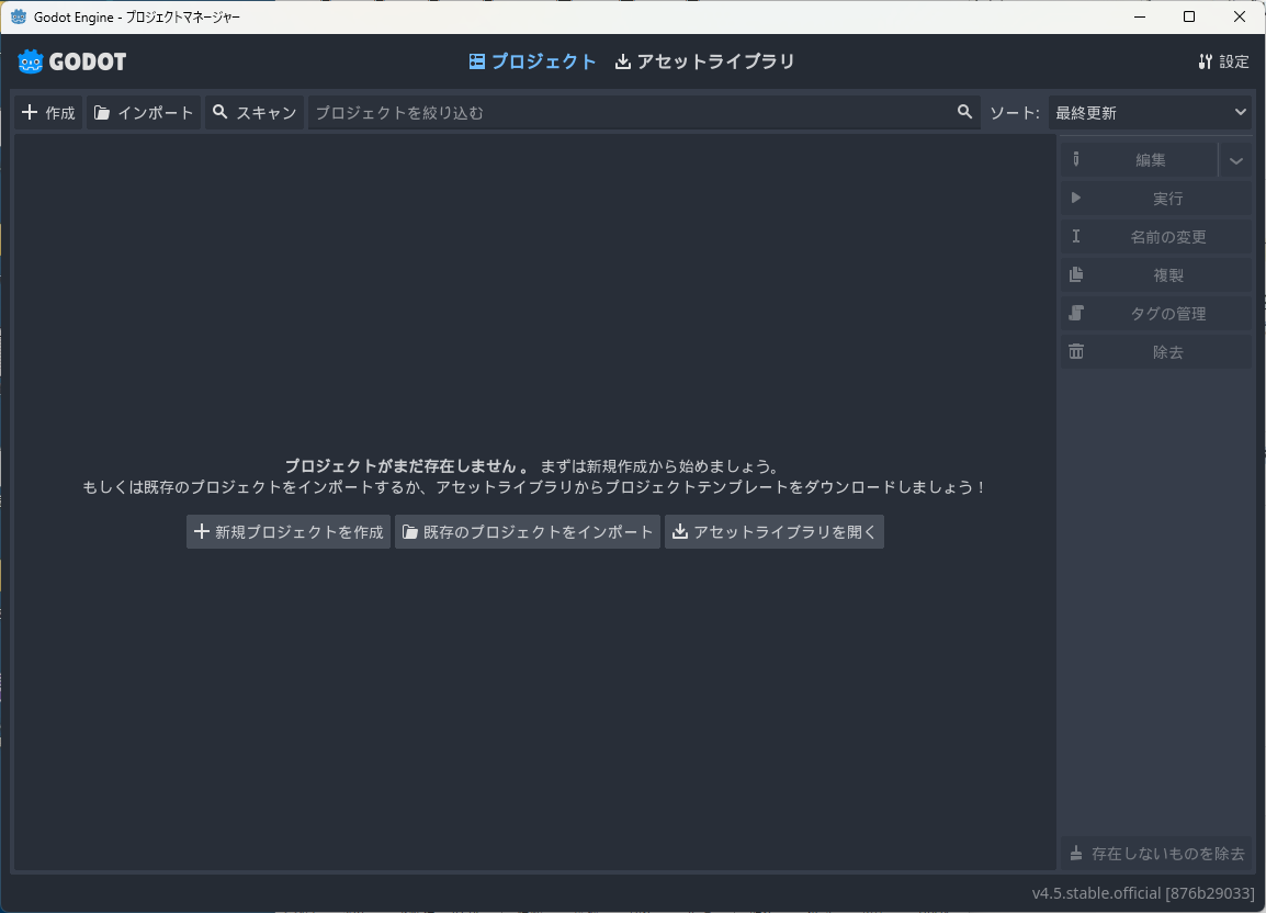 Godot_v4.5-stable_win64.exe をダブルクリック、またはショートカットから起動すると、この画面が表示されます。