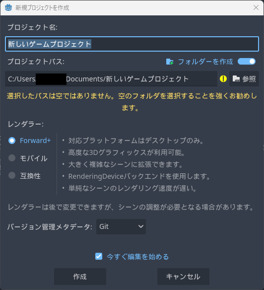 先程は黄色で「指定したパスは空ではありません…お勧めします。」という警告が黄色で表示されていましたが、空のフォルダを指定したことで、緑色で「プロジェクトフォルダが自動的に作成されます。」と変わりました。Godot では基本的には黄色が警告、赤色がエラーの表記となります。
