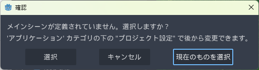 おっと、確認ダイアログが出てきました。ダイアログに表示されている通り、本来であればアプリケーション設定が必要なのですが、今回はそういう難しいことは省略してここまで作成してきました。いざ実行しようとしたら、どれが最初のシーンになるのか分からないので困ってしまって、こちら側にどうするのかと確認してきているのです。