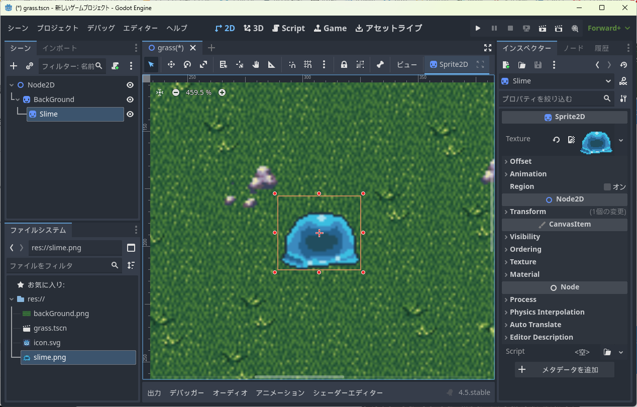 ここまでくれば、あとは地形画像表示の応用だけです。まず、Slimeノードを選択してください。インスペクターの Texture に、ファイルシステムから slime.png をドラッグ&ドロップします。
