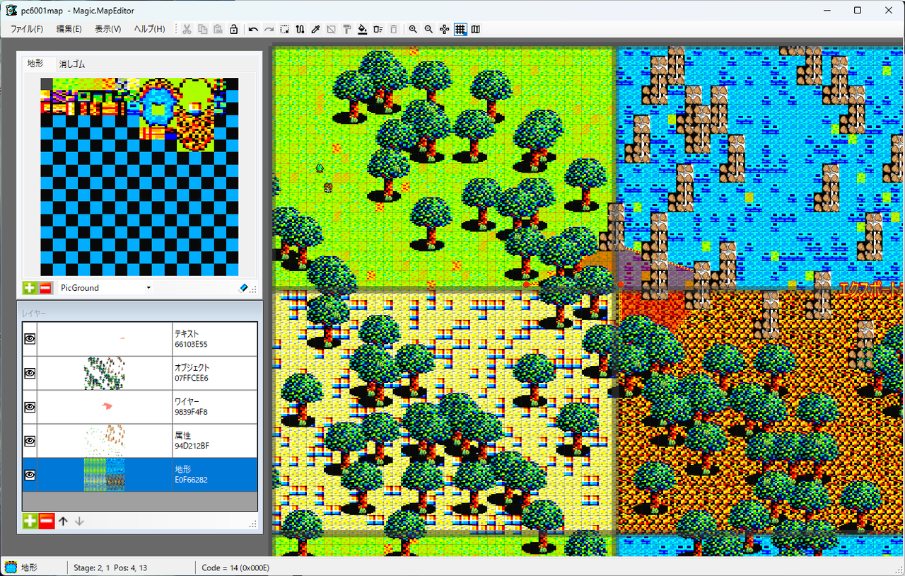 地形パーツには128個とか256個とかの自由なサイズのパーツ画像を使用することが出来ます。その柔軟性が災いしました。例えば、1枚目が128個、2枚目が256個の時に、2枚目で240番目のパーツを選択したまま、1枚目に切り替えると画像範囲外エラーを出していました。