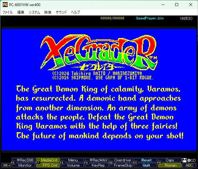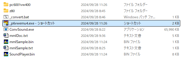 [ Start Emulation.] ボタンを押して音楽演奏されれば OK です。以降は、p6vwemu4.exe を起動するだけで、直接エミュが起動して、サウンドの確認ができるようになります。