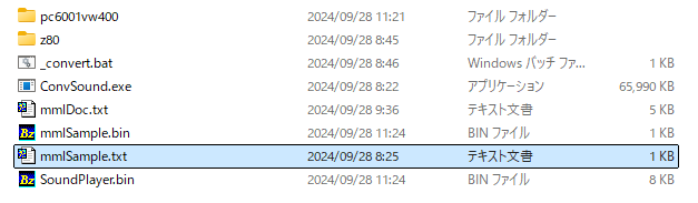 曲をMMLで記述したら、ConvSound.exe でバイナリ変換します。コマンドラインでファイル以外何も指定しなければ、その楽曲をコンバートしたデータが出力されますが、オプションで /P を指定すると、動作確認用の SoundPlayer.bin も同時に生成されます。試しに mmlSample.txt を変換してみます。このファイルを _convert.bat に D&D します。これだけで mmlSample.bin と SoundPlayer.bin が生成されます。