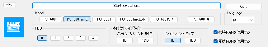正しく設定できたら pc6001vw400 フォルダ内の PC6001VW4.exe 起動して Model を PC-6001mkⅡ を選択します。